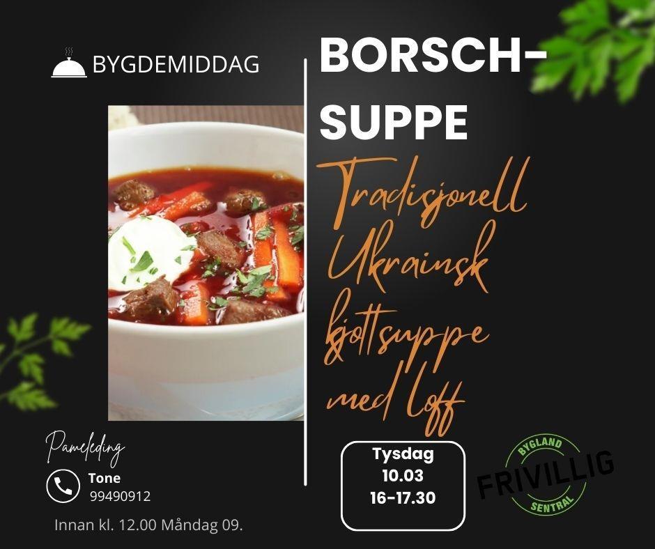 På Bygdemiddag tysdag 10.03.2026 kl. 16.00 - 17.30 blir det servert Borsch-suppe, ei tradisjonall ukrainsk kjøttsuppe med loff!