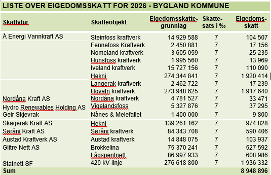 Med bakgrunn i kommunestyret sitt vedtak blir det i 2026 skrive ut eigedomsskatt på kraftverk og kraftnett, jf. eigedomsskattelova § 3 c. Med heimel i eigedomsskattelova §15, blir eigedomsskattelista lagt ut til offentleg ettersyn i tre veker frå den 27.02.2026.