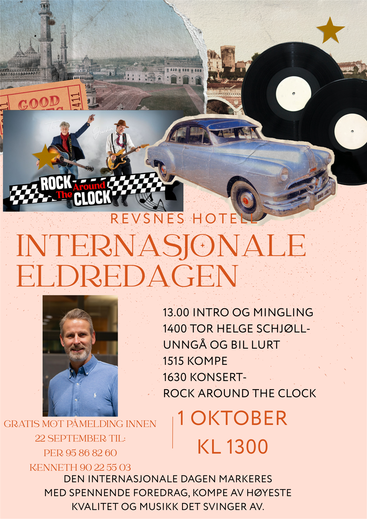 Markering av den Internasjonale Eldredagen 1. oktoberOnsdag 01.10.2025 markerer Rådet for eldre og personar med funksjonsnedsettingar og trivselskoordinatoren i Bygland kommune den Internasjonale Eldredagen på Revsnes Hotell.Internasjonale Eldredagen Set av dagen og meldt deg på!Onsdag 01.10.2025 kl. 13.00 og utover ettermiddagen markerer Rådet for eldre og personar med funksjonsnedsettingar og trivselskoordinatoren i Bygland kommune, Kenneth Fyhn, den Internasjonale Eldredagen på Revsnes Hotell.Me inviterer til både foredrag med Nina Merethe Olsen-Unngå og Bill Lurt, til kompemiddag og til svingande musikk!Arrangementet er gratis mot påmelding innan måndag 22.09. tilPer Odd Berge, tlf. 95 86 82 60 ellerKenneth Fyhn, tlf. 90 22 55 03Velkomen! Publisert 19.09.2025 11:05 Sist endra 23.09.2025 10:18