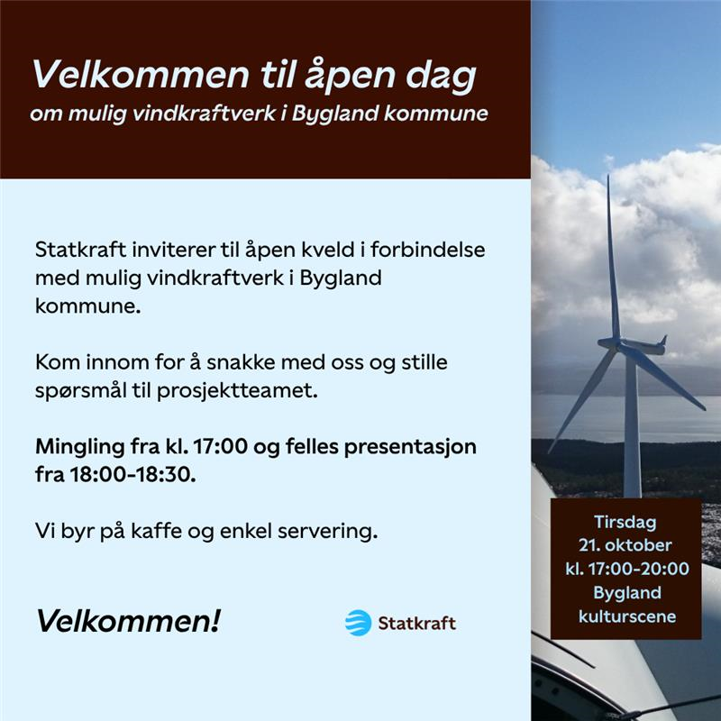 Statkraft inviterer til open kveld om mogleg vindkraftverk i Bygland kommune, tysdag 21.10.