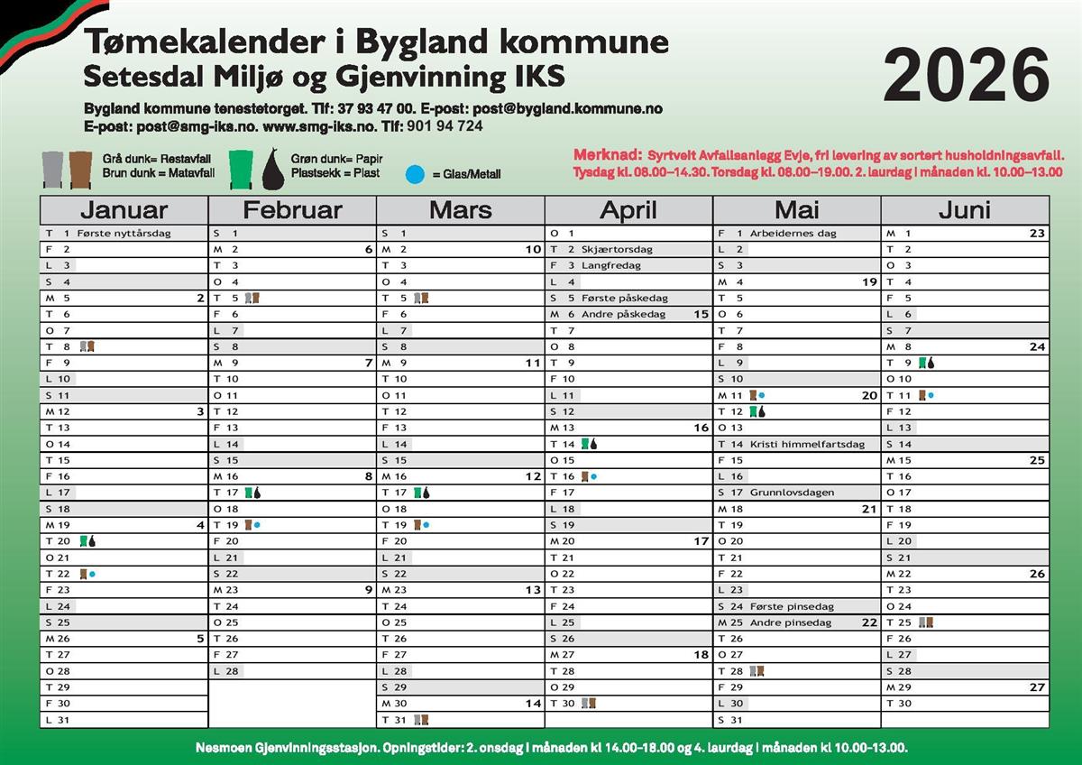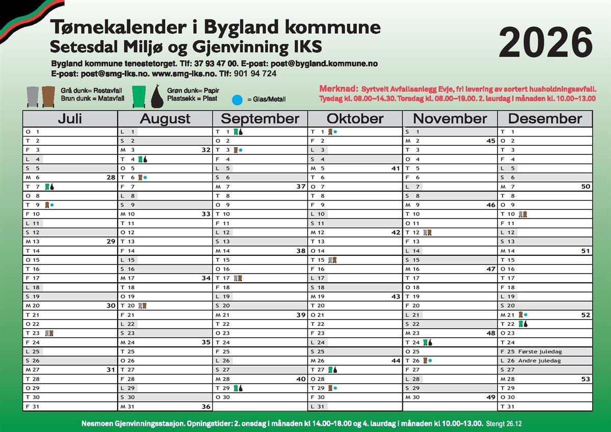 Tømekalender for Bygland 2026Setesdal Miljø og Gjenvinning IKS sender kvart år ut ein kalender over dagar for tøming av dei ulike avfallstypene.Tømekalender 1. halvår 2026 - januar-juni (JPG, 334 kB)Tømekalender 2. halvår 2026 - juli-desember (JPG, 337 kB)Informasjon om ordninga (Korleis du sorterer avfall, avfallsanlegg og elektronisk tømekalender).Meir informasjon vil du finne på SMG sine heimesiderTømekalender 2026 - 1. halvår Tømekalender 2026 - 2. halvår Publisert 07.01.2025 13:14 Sist endra 07.01.2026 16:03